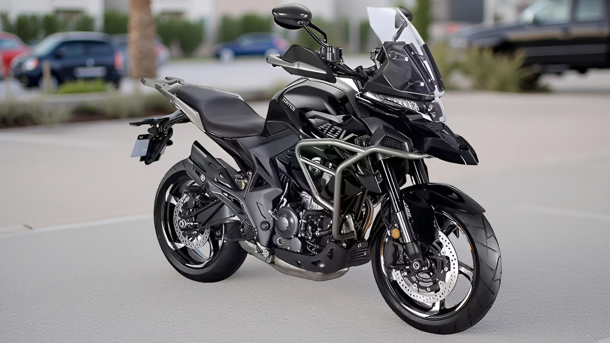 The Zontes 350T showcases a stylish adventure-touring design, featuring a split LED headlight setup that gives it a modern, aggressive look. Its electronically adjustable transparent windscreen adds both functionality and flair, while handlebar guards, crash guards, and a rear luggage rack enhance safety and practicality. The belly pan provides extra protection and completes the rugged appearance. With its bold design elements and thoughtful accessories, the 350T not only delivers performance but also stands out with a stylish, commanding presence on both city roads and highways.